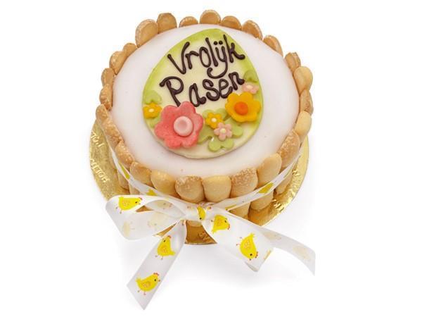 Vanillebavaroise met fruit en bitterkoekjes. Afgemaakt met biscuits de savoye en paasversiering. Voor 5 personen